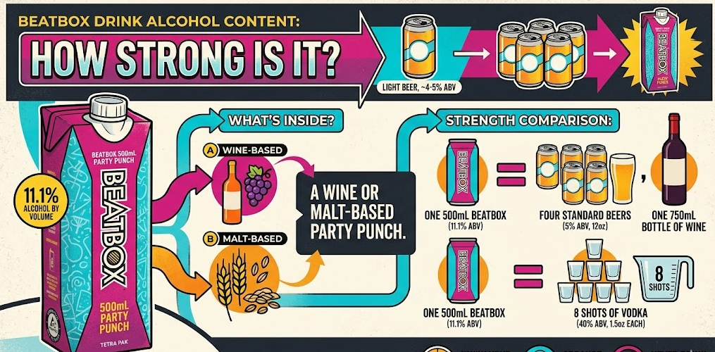 For those wondering how much alcohol is in a Beatbox drink, it typically contains around 11% to 13% ABV (Alcohol by Volume). This alcohol content is higher than most beers (which usually range from 4% to 6% ABV), placing Beatbox on a similar level to wine or certain spirits. This makes it an excellent choice for those looking for a stronger beverage without the complicated process of mixing cocktails.