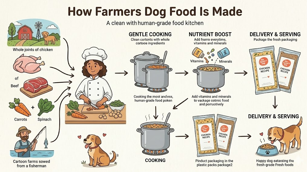 The preparation process for farmers dog food is different from traditional kibble manufacturing. The company focuses on a method closer to cooking real meals.